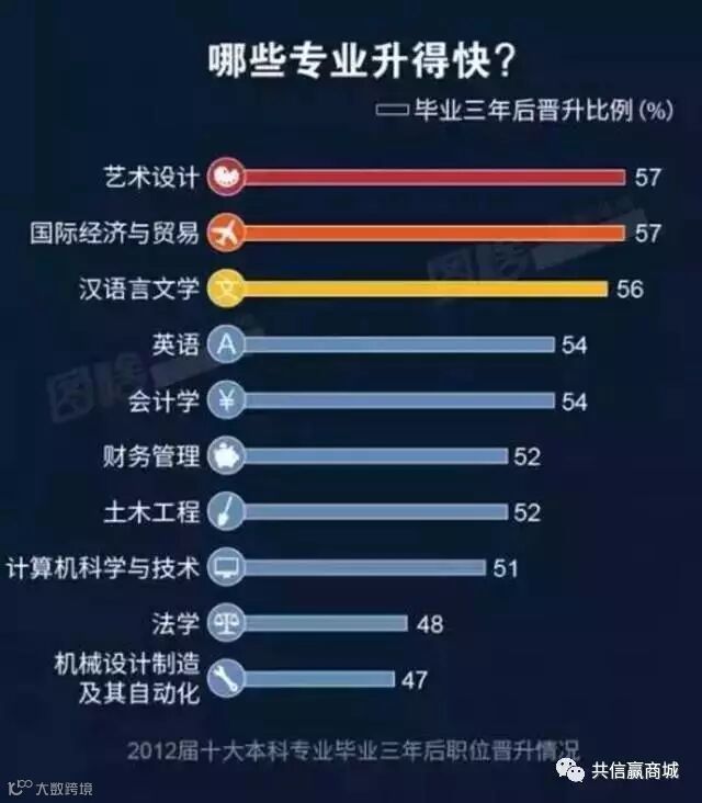 数据显示,在本科十大专业中,2012届本科生毕业三年内职位晋升比例较高的专业为“艺术设计”和“国际经济与贸易”专业,均为57%;晋升比例较低的专业为法学、机械设计制造及其自动化,为47%。