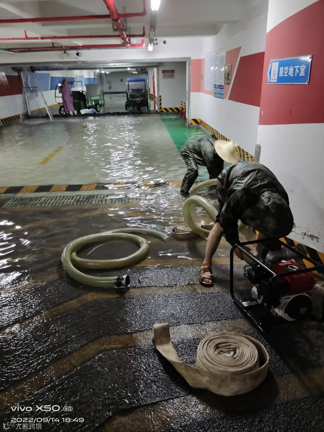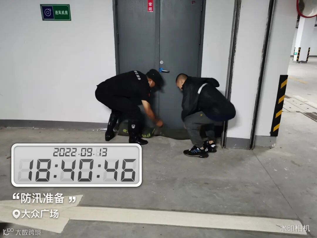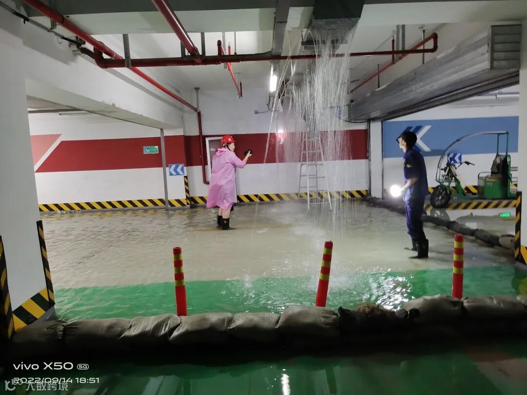 14日晚19点左右,绿地观堂社区防空地下室坡道出现倒灌险情,项目组果断封闭出入口,开启抽水泵进行排水工作,有效控制住危机。
