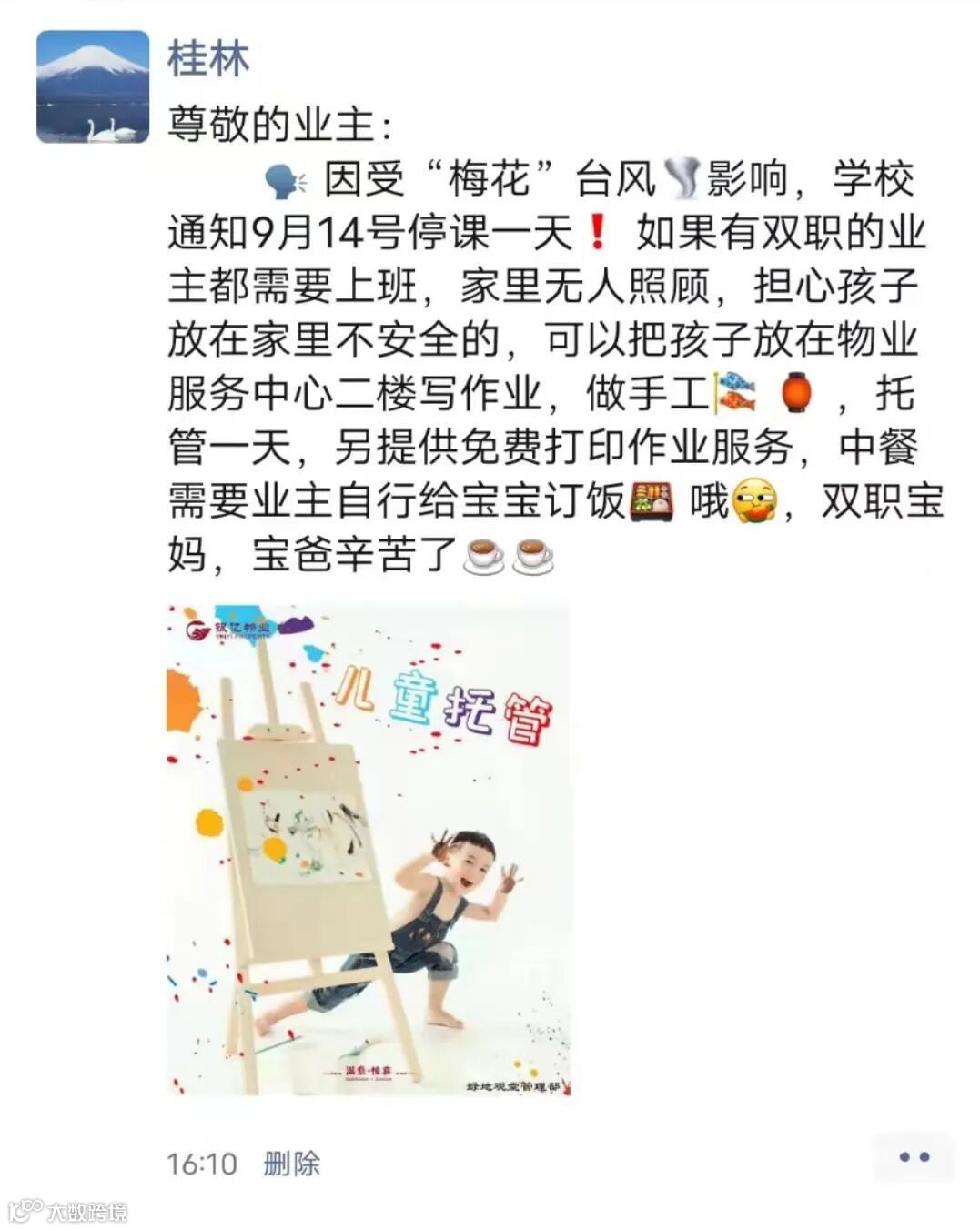 针对台风天学校停课、双职工家庭子女独自在家的“难题”,银亿物业不断提升服务品质,推出了儿童托管的暖心服务。