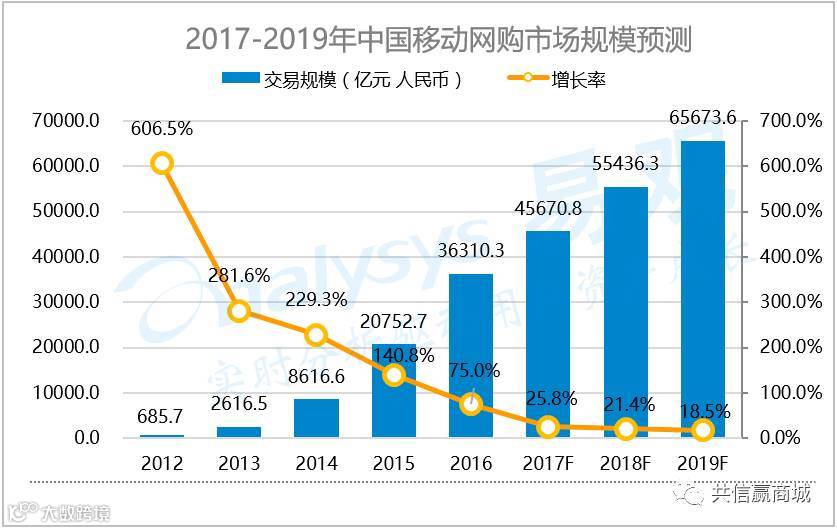 根据Analysys易观预测数据显示, 2016年中国网上零售市场规模达到49687.5亿元人民币,较2015年增长29.6%。预计到2019年,中国网上零售市场规模将达到约8.1万亿元人民币。