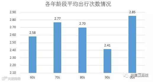 而就出行年龄层次而言,00后竟是出行频率最高的群体,平均出行次数达到2.85次,而90后垫底, 平均出行次数仅为2.41。