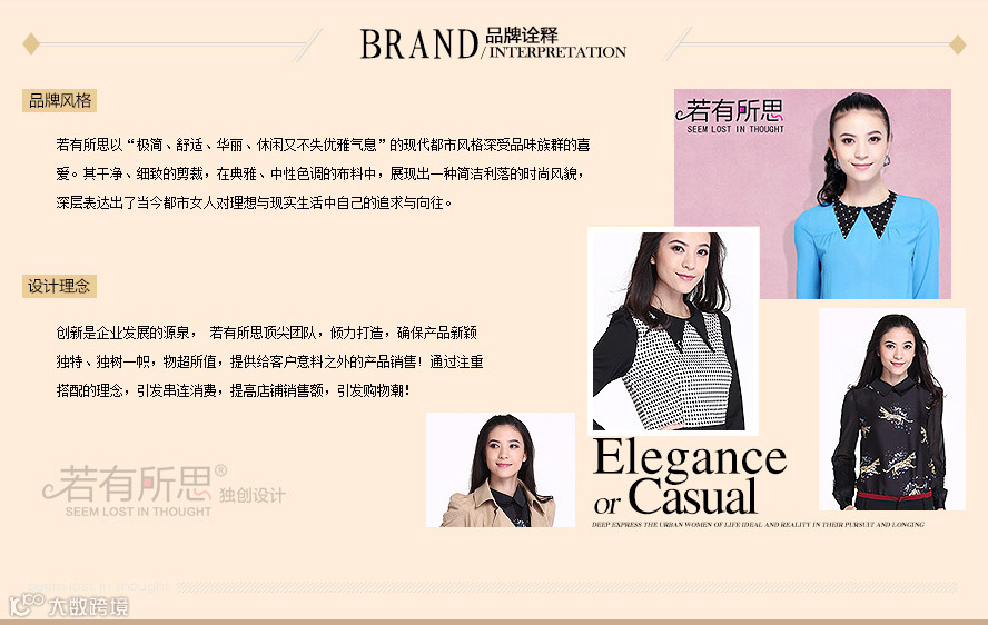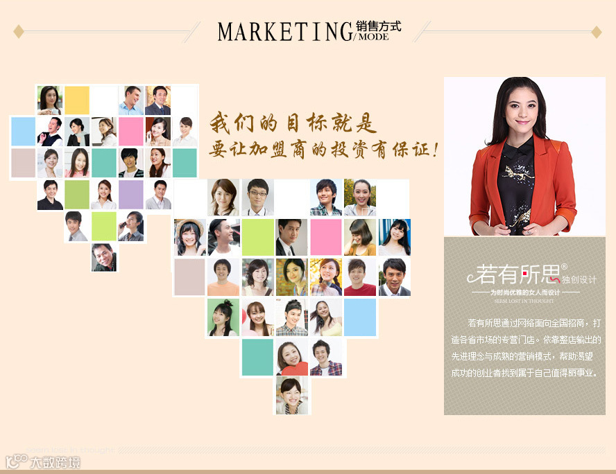 2013年,若有所思立足杭州,以“极简、舒适、华丽、休闲又不失优雅气息”现代都会风格深受品味族群的喜爱。干净、细致剪裁,在典雅、中性色调的布料中,展现一种简洁利落的时尚风貌。并深层表达当今都市女人对理想与现实生活中自己的追求与向往。通过网络面向全国招商,打造各省市场的专营门店!蔓菈媞依靠整店输出的先进理念与成熟的营销模式,帮助渴望成功的创业者找到属于自己值得一生去奋斗的美丽事业。标准化、模式化、简单化是若有所思与加盟商成功的秘决!