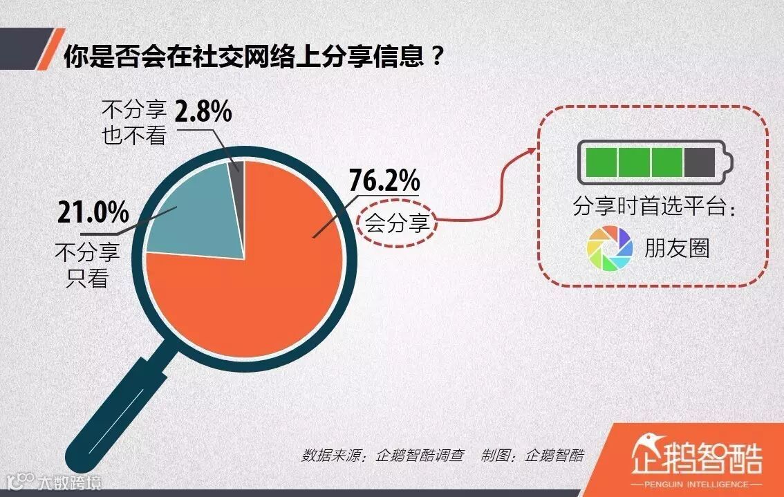 在愿意分享的用户中,约四分之三将朋友圈作为自己分享时的首选平台。“刷刷刷刷,刷我的朋友圈”,不难看出,以熟人关系为主、私密性更强的朋友圈已经是国内最核心的社交分享网络。