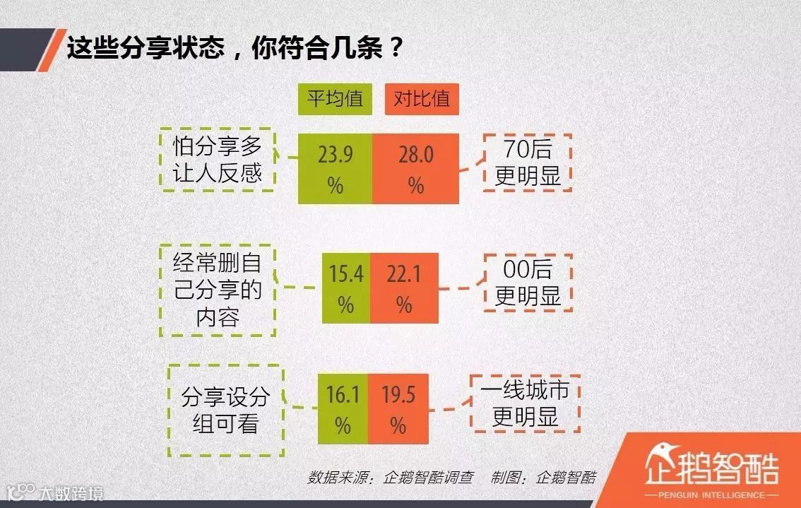 相比其它年龄用户,70后群体更担心自己分享多,会引发好友反感。这里需要提及的是,70后也是更爱分享文章的群体,约50%的70后经常分享文章,而经常分享自己心情和生活状态的70后,占比只有36.8%。这一点和低于其年龄段的群体产生了明显差异。