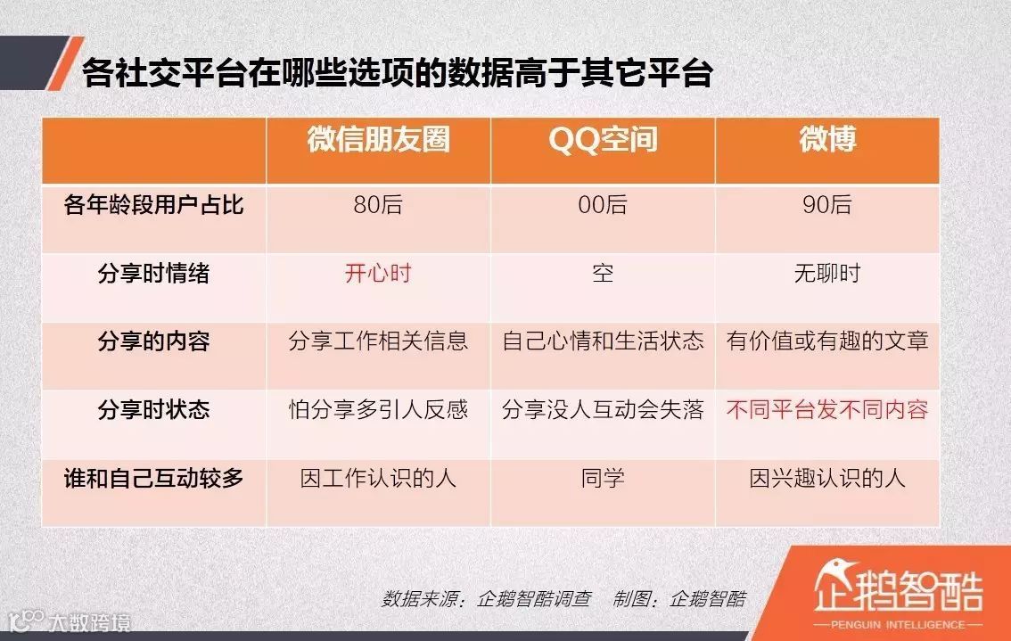 微信朋友圈:80后用户、用户更易在开心时分享、分享工作相关信息、怕分享多引人反感、因工作认识的人和自己互动较多,这些方面的用户占比都要高于QQ空间和新浪微博。