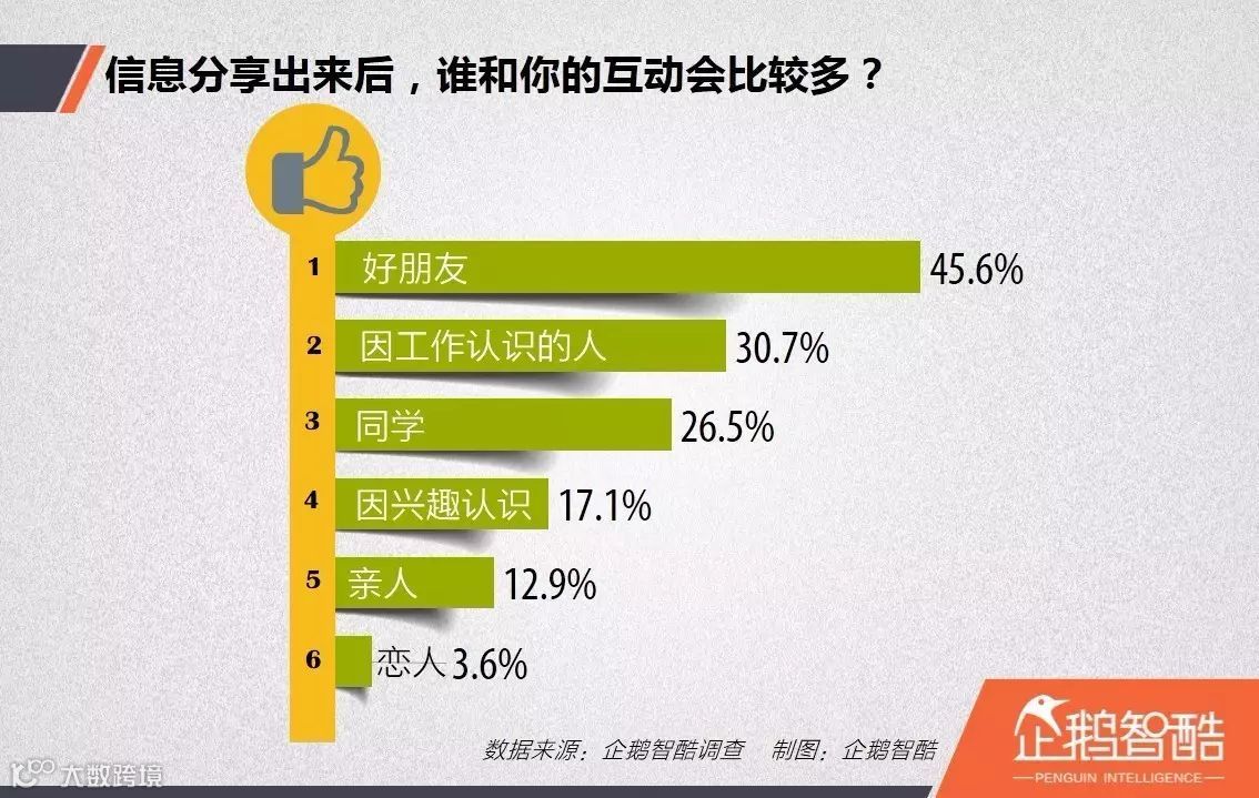 互动越多,用户分享的积极性也会相应提高。从调查结果来看,信息分享后,和用户之间分享互动比较多的,首先还是自己的好朋友。其次是因工作认识的人和同学。