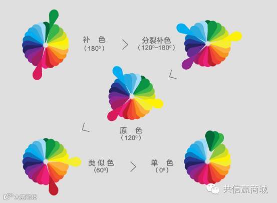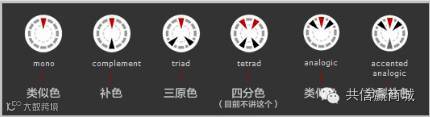 类似色配色:以一个主色搭配在他两旁等距的两个颜色类似色都有共同的颜色(在以下图中是黄色,这种颜色搭配原色搭配产生了一种令人悦目/低对比度的和谐美感。