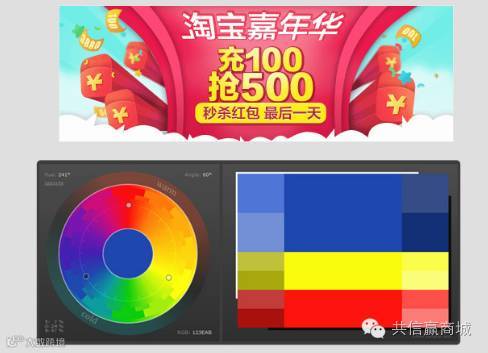 互补色配色:在色轮上直线相对的两种颜色称为补色,在下图中是红色及绿色形成强烈的对比效果,传达出活力、能量、兴奋等意义。补色要达到最佳的效果,最好是其中一种面积比较小,另一种比较大。