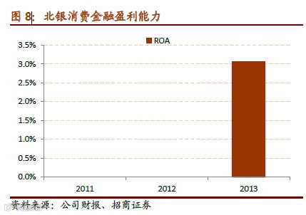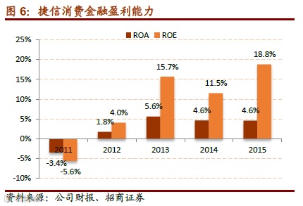 1)从ROA来看:2014 年末消费金融公司资产 224.23亿元,实现净利润4.66亿元, 以此测算 2014 年消费金融公司平均 ROA 为 2.1%,但考虑 2014 年新开业的 2 家消费 金融公司可能尚未盈利,不能代表消费金融行业的真实盈利水平;锦程、捷信开业 5 年后,ROA 水平基本稳定在 4%-5%之间(中银略低,2015 年上半年 ROA 年化只有 2.8%,但近两年提升较快),我们认为 4%-5%的 ROA 或许是消费金融行业的长期均衡 水平。
