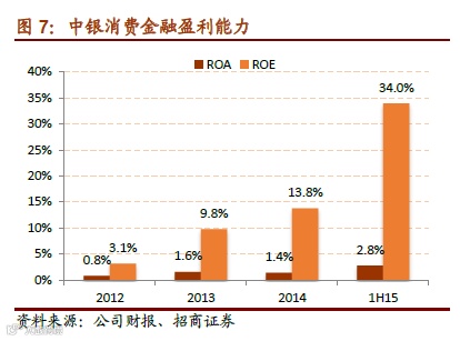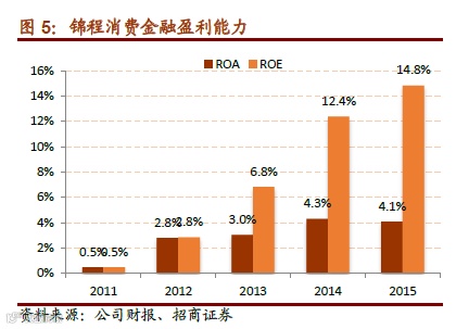 2)从 ROE 来看:锦程、捷信 2011 年以来基本都处于持续上升的过程,这主要得益于 消费金融公司杠杆的持续提升,目前 4 倍左右杠杆水平的情况下,锦程、捷信 2015 年 ROE 分别为 15%、19%;中银则主要得益于高达 12 倍的杠杆,2015 年上半年年化 ROE 高达 34%。我们认为随着消费金融公司的杠杆用足,40%的 ROE 水平并非难事。
