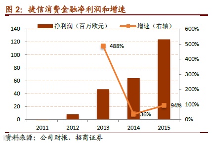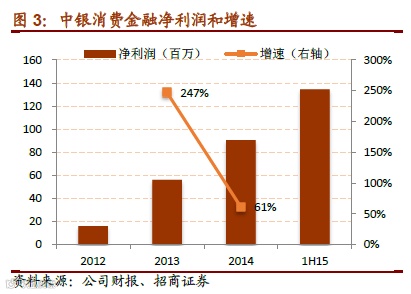 剔除 2013 年之前由于基数原因导致的超高利润增速,2014-2015 年锦程、捷信净利润复合增速分别为 68%和 63%,中银 2014 年净利润增速也有61%(中银 2015 年净利润只有上半年数据)。