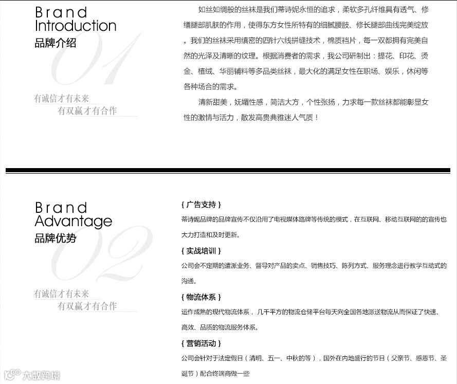于2010年创立的蒂诗妮,短短数年时间,营销网络已覆盖全国180多个大中城市,一路飘红!业绩是用产品来说话,蒂诗妮丝袜采用缜密的四针六线拼缝技术,高端棉质裆片,产品柔软多孔具有透气、修缮腿部肌肤的作用。拥有提花、印花、烫金、植绒、华丽辅料等多品类丝袜,科技结合时尚,最大化的满足女性在职场、娱乐、休闲等各种场所的需求。