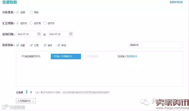 在这里,我们可以自由地选择需要提取的数据,选取需要的维度:时间,店铺/商品对具体的页面数据进行分析。以店铺目前其中一个商品A为例,我们分析它的停留时长数据情况: