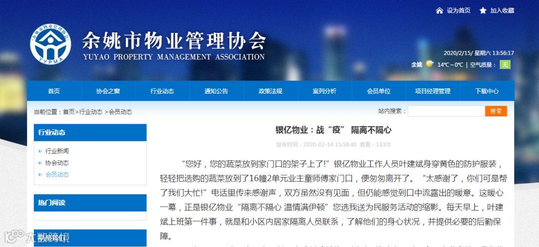2020年2月3日晚,小区内一户业主被确诊感染新冠状肺炎时,物业管理部项目经理曾陈立即启动防控一级响应,会同街道防控人员随即封锁单元楼,并带领同事叶建斌临危受命做起了整幢楼的管家。