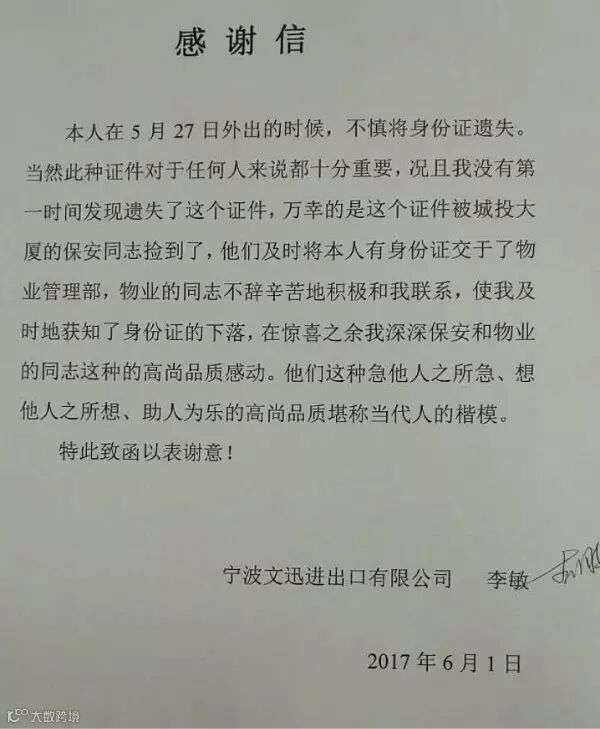 5月27日,城投大厦管理部秩序维护员捡到一张身份证,及时归还失主。