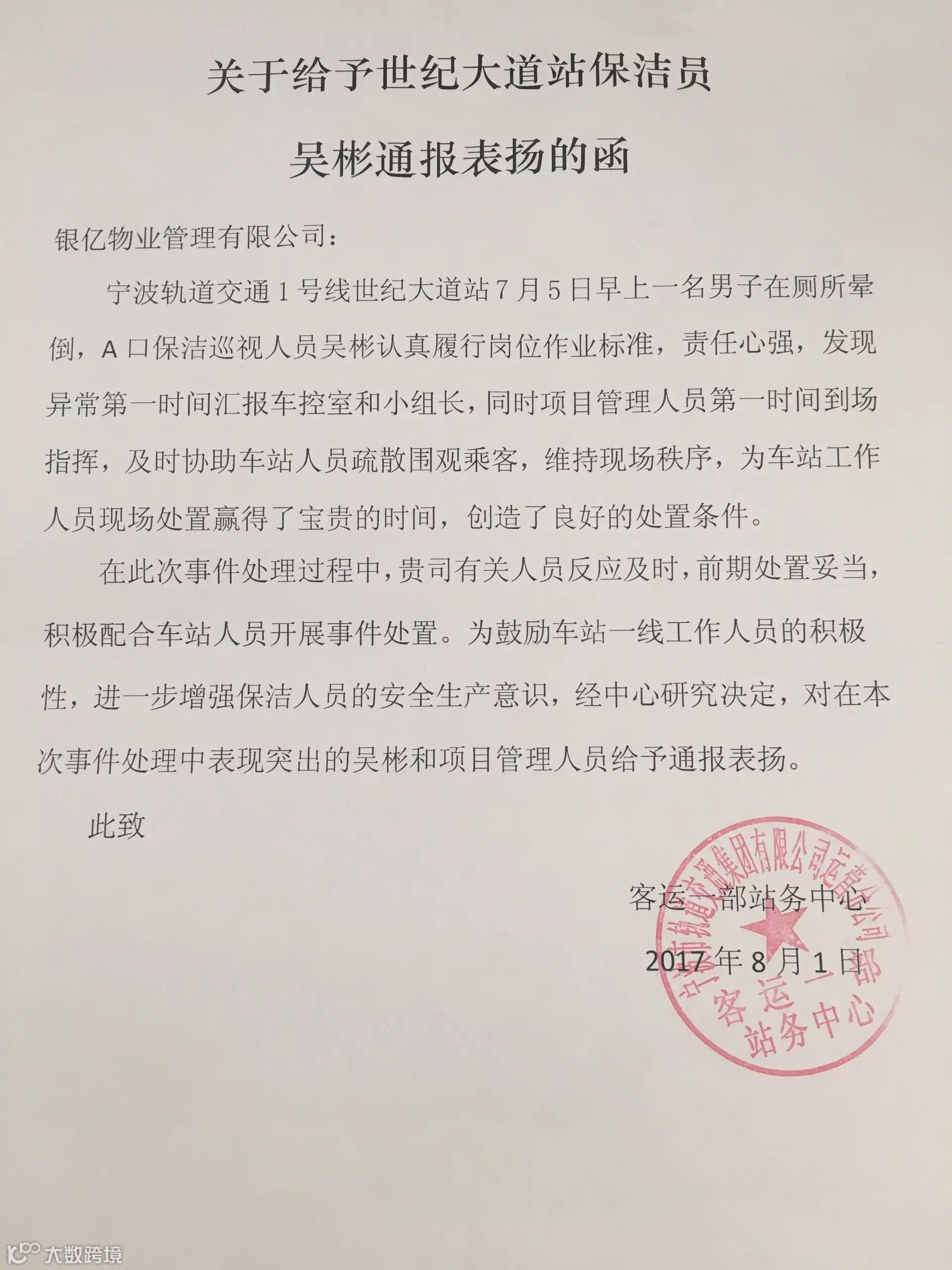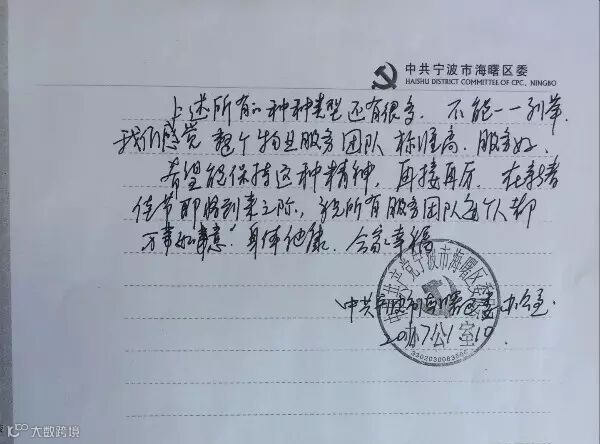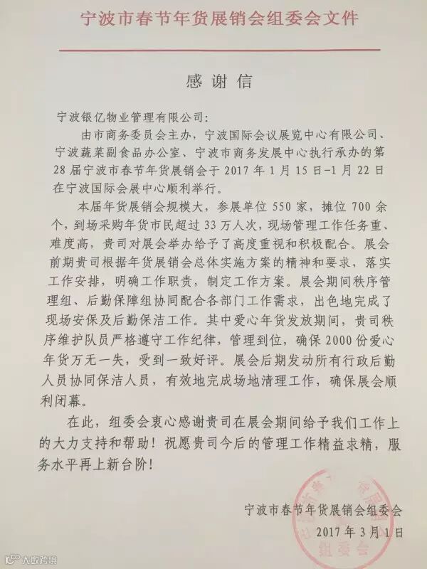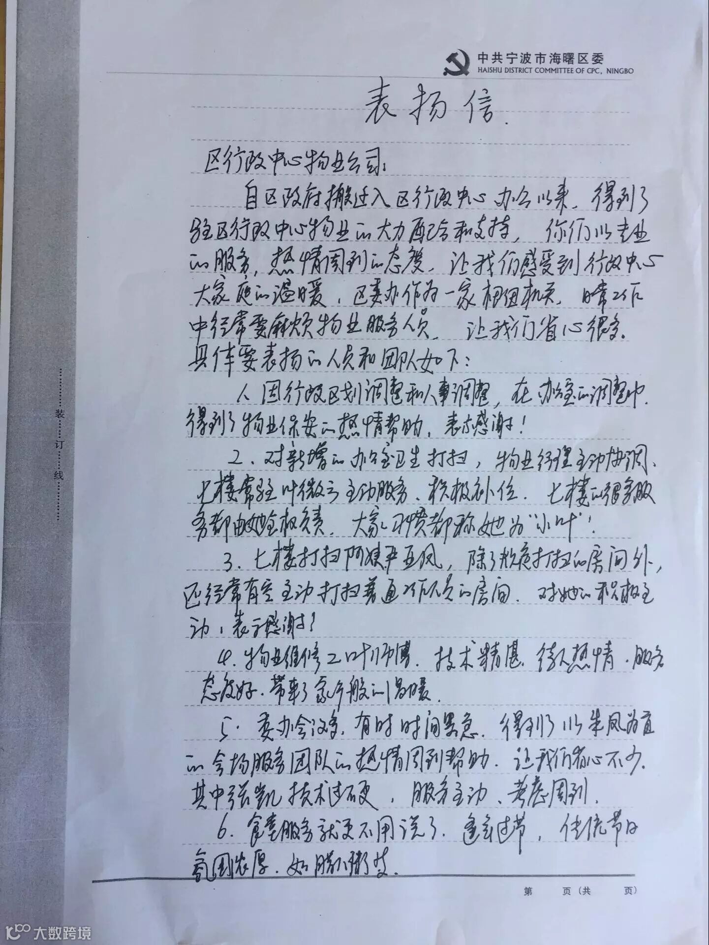 2017年海曙区行政中心项目真诚地服务得到了区行政中心的表扬。