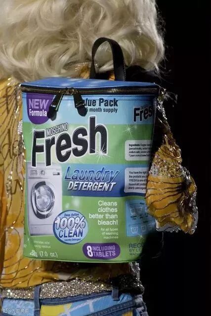 设计师 Jereme Scott 延续品牌一贯是风格让模特们背的可全都是日用百货。牙膏、洗洁精、吹风机、熨斗……别不信,这真的很 MOSCHINO:怪异+趣味+没什么偶像包袱!!!