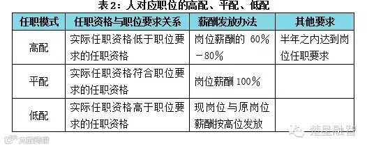 其次,任职资格体系的建设可以为岗位的竞聘和应聘提供考察标准,并且根据竞聘/应聘人的测评结果,可以采用低配、平配和高配三种模式,对于每种模式,公司可以采取不同的管理手段和方法,具体如下页表2所示。