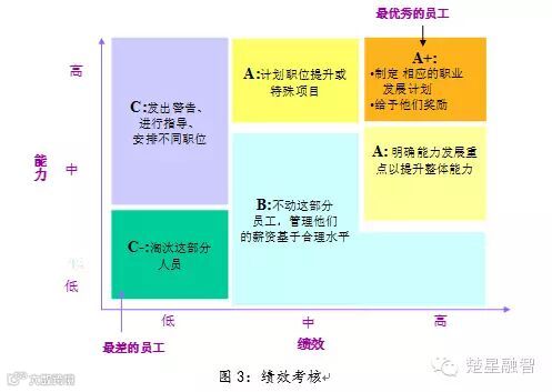 在没有建立任职资格之前,许多企业都是根据绩效考核的结果来把人员进行分类,考核优秀的是优秀员工,要晋升和提升,考核不好的是差的员工,需要末位淘汰。这种方式忽视了外界因素的影响,从而会出现一些能力较强的员工由于客观原因导致业绩不好,因考核结果影响了在企业的发展前途,也会出现一些能力一般的员工由于运气或客户因素导致业绩很好,从而获得晋升机会,结果到更高的岗位上无法胜任,从而阻碍了企业的发展。所以我们可以建立绩效考核结果与任职资格的两个维度综合的人员分布,从而对不同的人员采取不同的策略,具体可见图3。