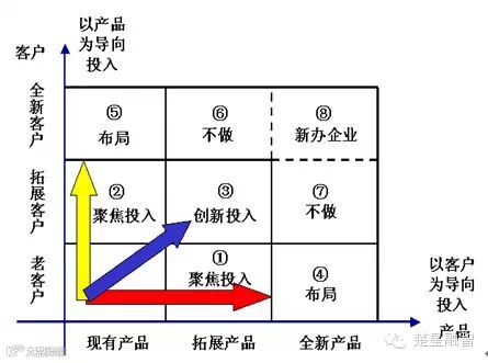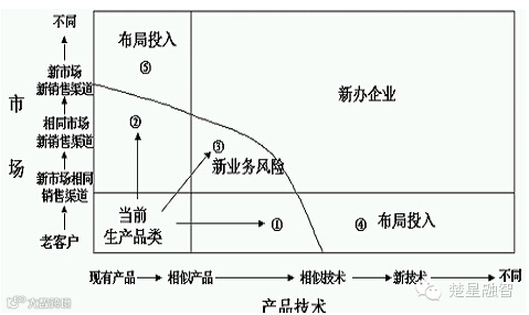 企业首先要扩张的区域在①区域内,即围绕着相同的市场和渠道做一些技术改进或推出一些相似产品。这样可以保证需求的准确,也可以确保产品推出后即可占有原有的用户和原有市场。