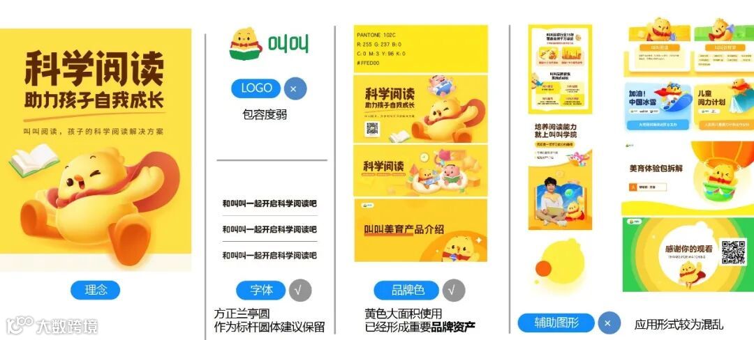 原有logo,以小鸡叫叫IP,为主体,搭配代表“阅读”的书本造型。低龄化的IP限制了品牌扩龄的需求;“书本”限制叫叫发展其他学科的可能。