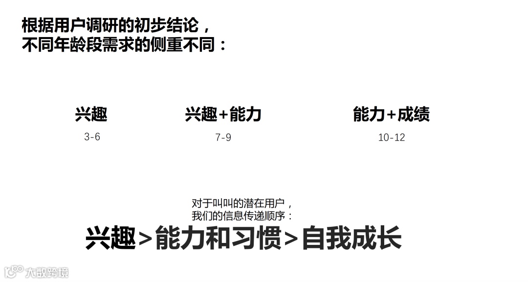 然而,如何能更直白的让家长了解这个逻辑,更直白的与用户的感受建立共识,通过共鸣进一步强化存量用户的口碑和主动传播?从需求的角度看以上链路中的三个环节哪个是家长更关注的呢。