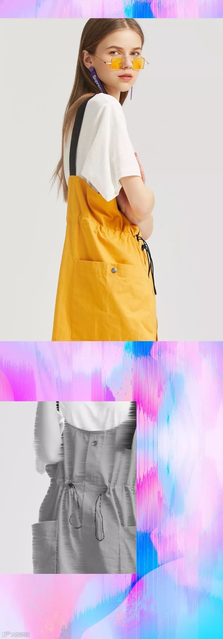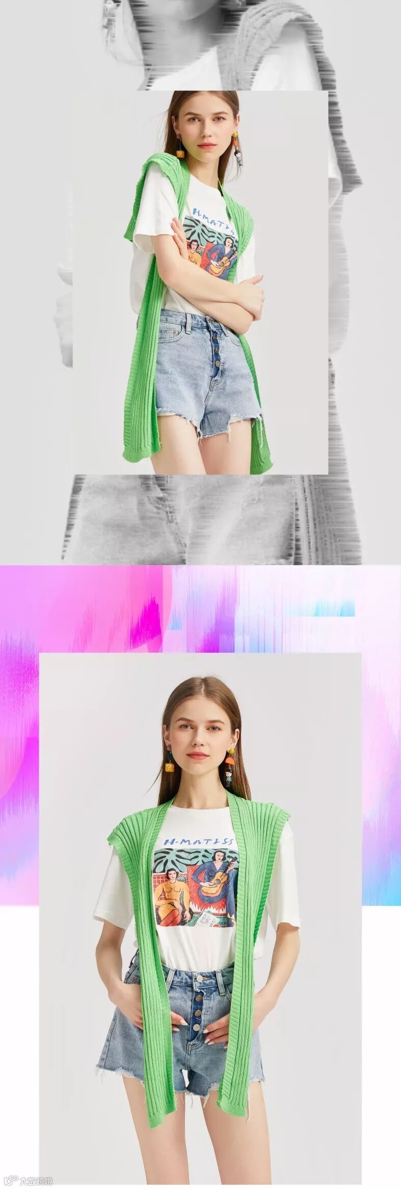 搞怪耳饰,撞色披肩,随性牛仔短裤