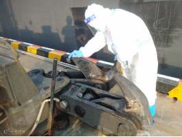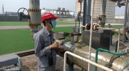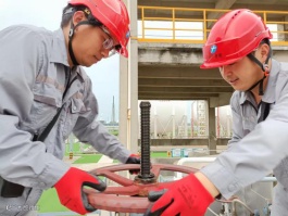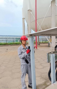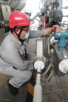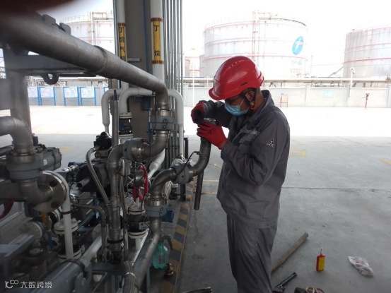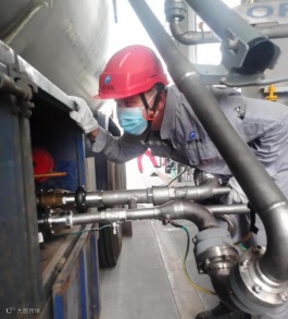 港储公司设备管理员王晓文,高温下紧急检修更换充装台装卸臂快速铜头。