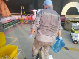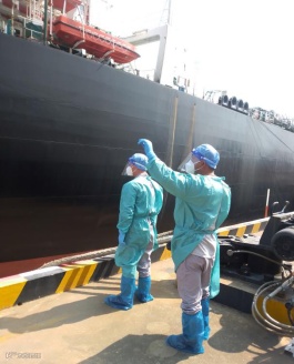 “尼古拉斯船长”离泊,港务公司甲班员工周晓军和俞金献,高温下穿着防护服进行离泊解缆、脱缆钩复位等。脱下防护服后,全身衣服已被汗水湿透。