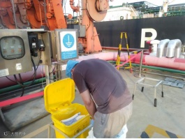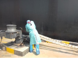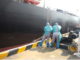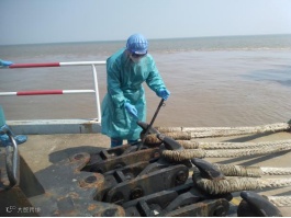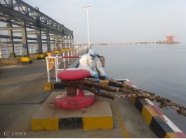 “玛塔汽船”外轮离泊,港务公司丁班员工张峰、张军浩,代班李杰,顶着烈日,穿着防护服操作快速脱缆钩解缆、合力解后横缆等。