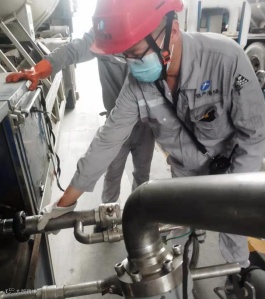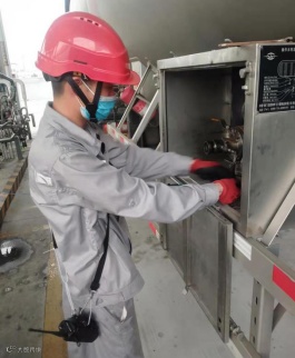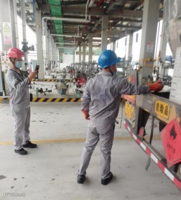 港储公司甲班员工赵伟、周亮、蔡凯浩,高温下严格按照操作规程做好槽车充装检查工作。