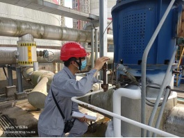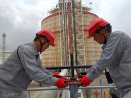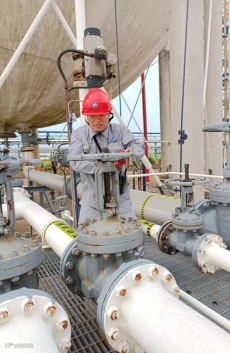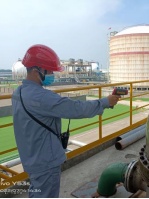 港储公司乙班库区员工建永吉顶着高温,检查丙烷倒料管线温度并进行调节。