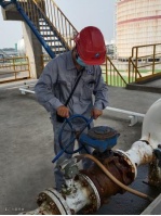 港储公司乙班库区员工姚英伍顶着烈日,做好巡检,并记录运行参数。
