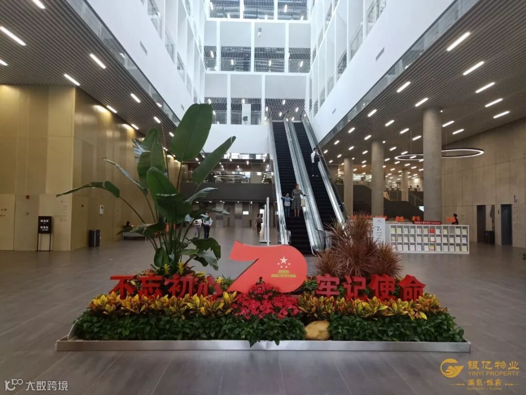 海曙区行政中心四套班子领导及下属各机关主要领导庆祝国庆70周年活动,计划于2019年10月1日早上8点在区政府大院内举行升旗仪式;活动前对场地进行相关布置并对环境卫生进行把控。