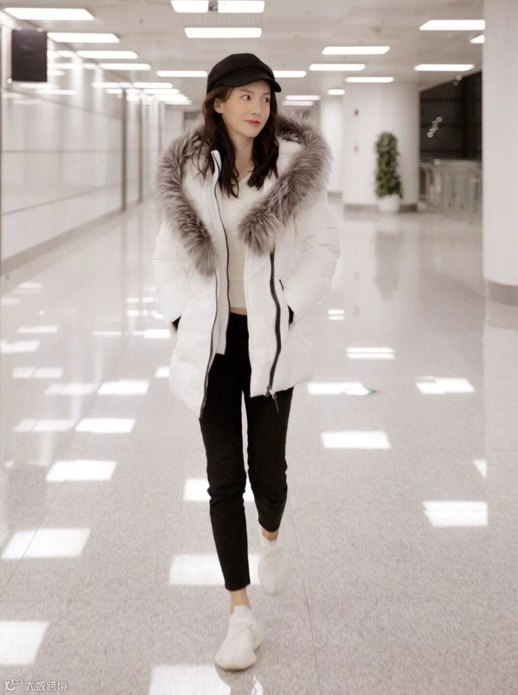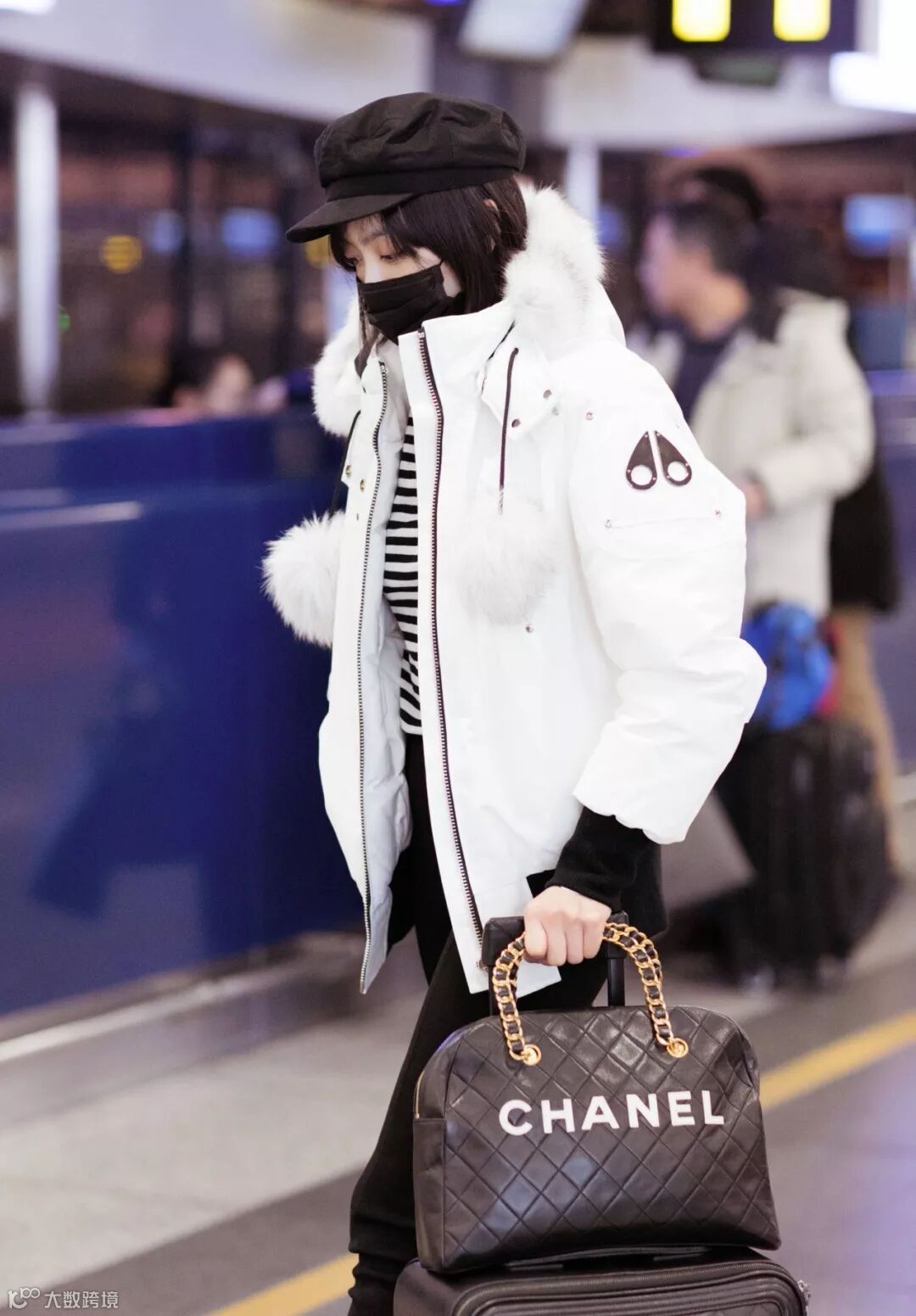黑白配色鹅绒羽绒服加Chanel大标也非常适合冬日出行。