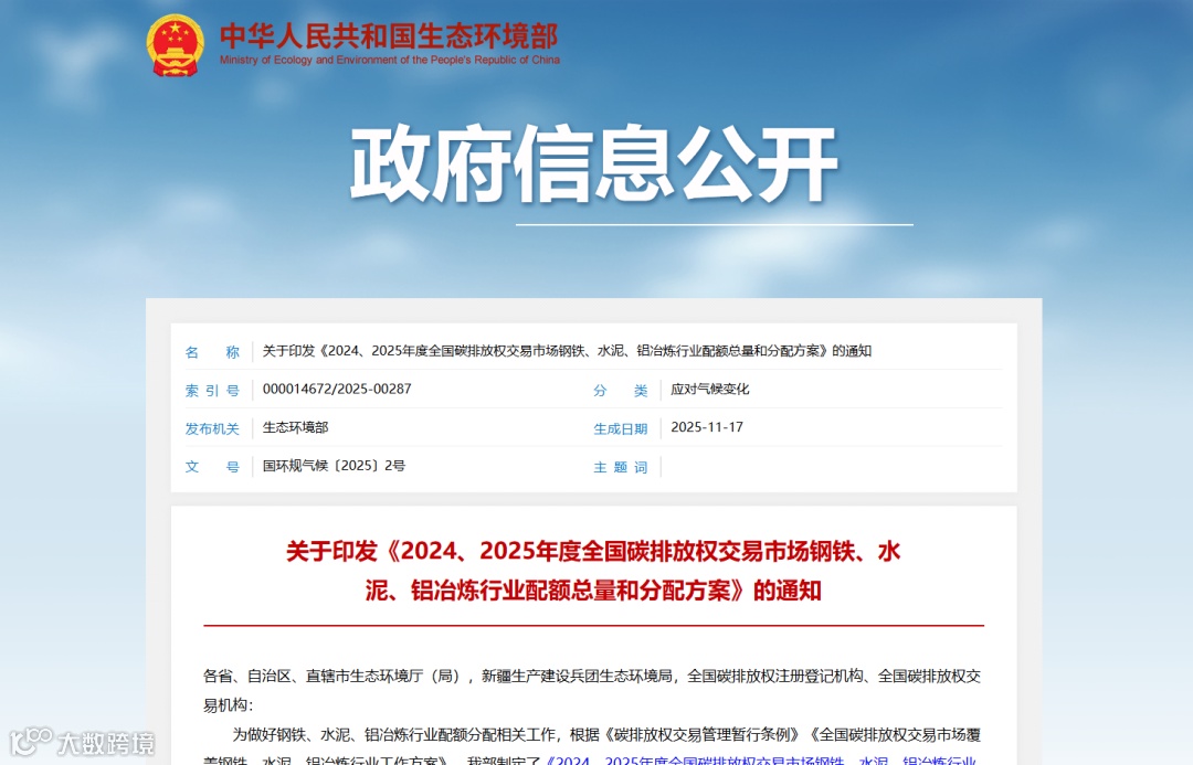 近日,生态环境部依据《碳排放权交易管理暂行条例》及《全国碳排放权交易市场覆盖钢铁、水泥、铝冶炼行业工作方案》,正式印发了《2024、2025年度全国碳排放权交易市场钢铁、水泥、铝冶炼行业配额总量和分配方案》(以下简称《配额方案》)。这标志着继发电行业之后,全国碳排放权交易市场实现了首次行业范围扩展,钢铁、水泥、铝冶炼这三个关键的高排放行业被正式纳入管理,覆盖的温室气体种类包括二氧化碳(CO₂)、四氟化碳(CF₄)和六氟化二碳(C₂F₆)。