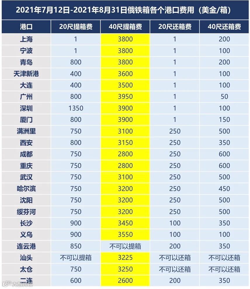自2021年7月12日-2021年8月31日,中国大部分港口40尺俄铁箱提箱费上涨500美金。于2021年7月12日前下订单并被俄铁集批复同意的订单,提箱费价格不变,未同意的订单都以更新版为准。给您带来不便,敬请谅解!