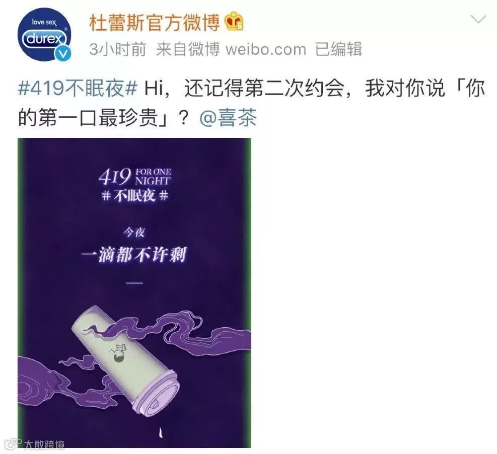 说到品牌人设翻车事件不得不提杜蕾斯和喜茶的跨界联名,杜蕾斯以“风流雅痞”著称,