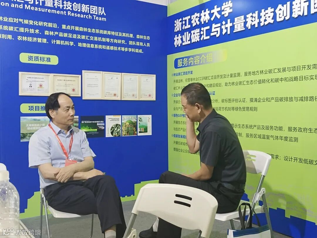 浙江农林大学展台主要由“获奖成果”“资质标准”“实践案例”“科普推广”和“服务内容”等主题构成,运用实物、图文、多媒体手段,多形式呈现了我校林业碳汇创新团队和竹林碳汇工程技术中心在“双碳”领域尤其是林业碳汇领域的相关技术成果,全方位展示了浙江农林大学在林业碳汇计量标准制定、方法学开发、产品碳足迹核算和碳标签认证、区域低碳规划和低碳科普创作等方面的成果。专业的技术、丰富的案例和生动的科普吸引了众多参展商和观众参观交流、咨询洽谈。