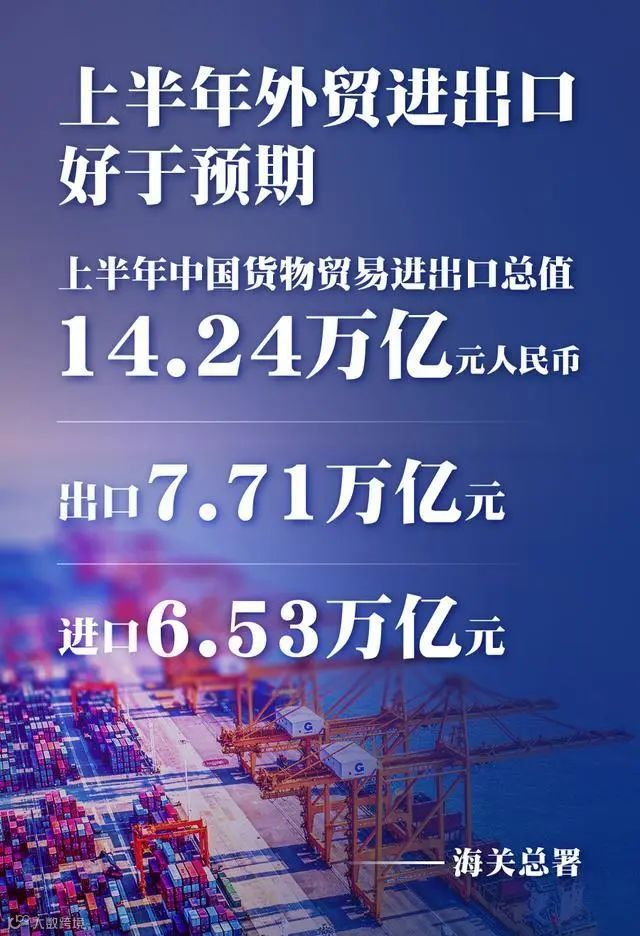 据海关统计,今年上半年,我国货物贸易进出口总值14.24万亿元人民币,同比下降3.2%,降幅较前5个月收窄1.7个百分点。其中,出口7.71万亿元,下降3%;进口6.53万亿元,下降3.3%。