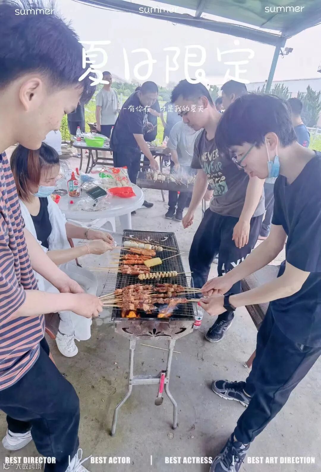 到了午餐时间,大家齐动手,一边洗锅、淘米、生火,一边剥蒜、引火、烧炭,开始烧烤,忙得不亦乐乎。
