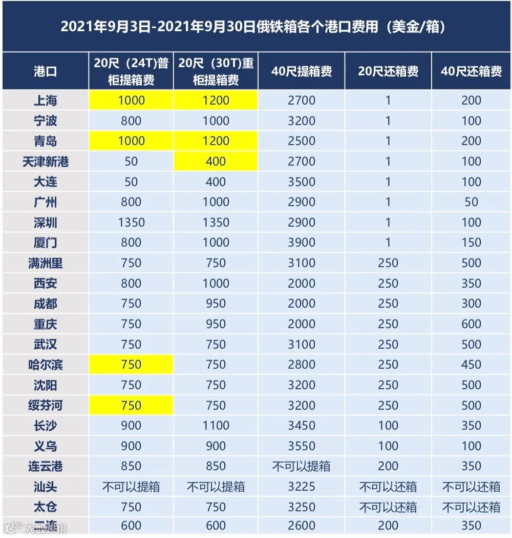 自2021年9月3日-2021年9月30日,中国部分港口20尺提箱费有所上涨。于2021年9月3日前下订单并被俄铁集批复同意的订单,提箱费价格不变,未同意的订单都以更新版为准。给您带来不便,敬请谅解!