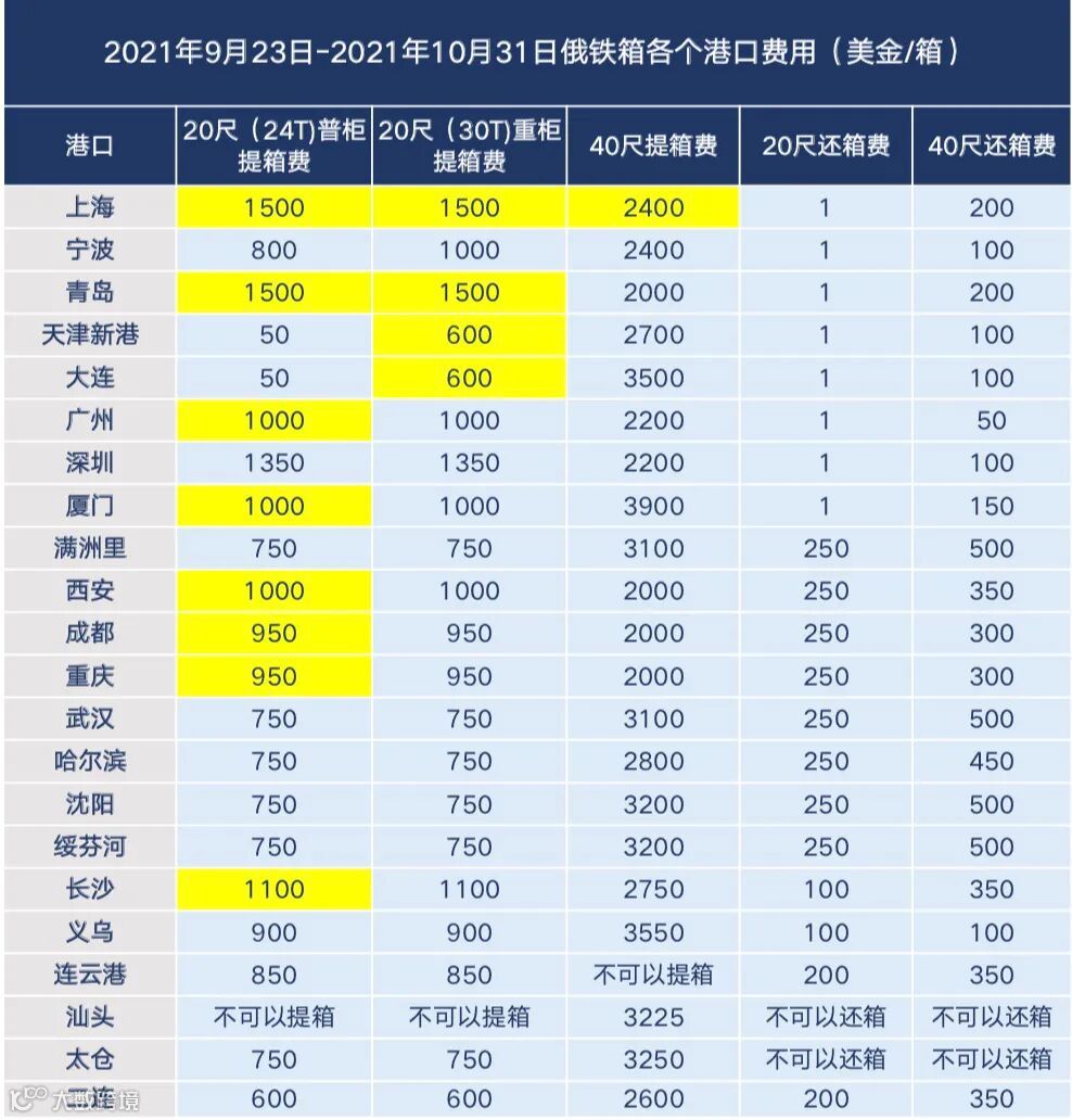 自2021年9月23日-2021年10月31日,中国部分港口20尺和40尺提箱费有所上涨。于2021年9月23日前下订单并被俄铁集批复同意的订单,提箱费价格不变,未同意的订单都以更新版为准。给您带来不便,敬请谅解!