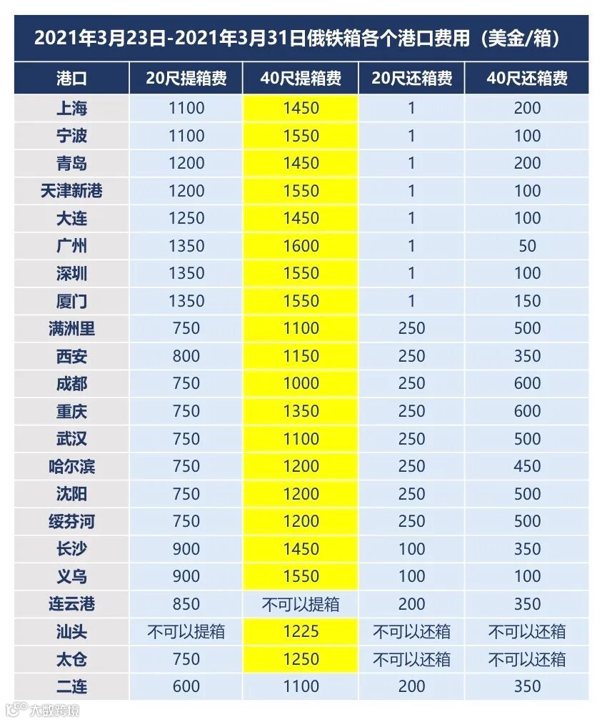 自2021年3月23日-2021年3月31日,中国大部分港口40尺提箱费下降1000美金。于2021年3月23日前下订单并被俄铁集批复同意的订单,提箱费价格不变,未同意的订单都以更新版为准。给您带来不便,敬请谅解!