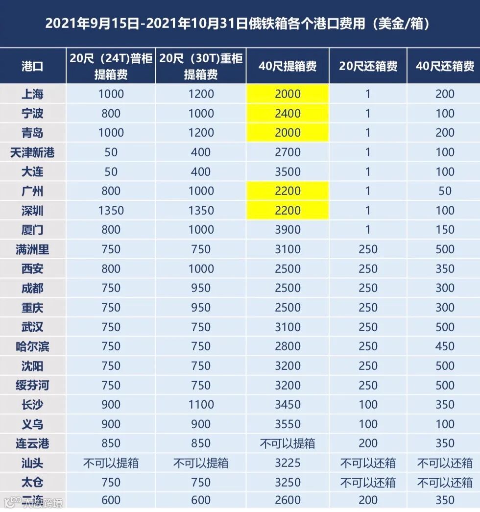 自2021年9月15日-2021年10月31日,中国部分港口40尺提箱费有所下降。于2021年9月15日前下订单并被俄铁集批复同意的订单,提箱费价格不变,未同意的订单都以更新版为准。给您带来不便,敬请谅解!