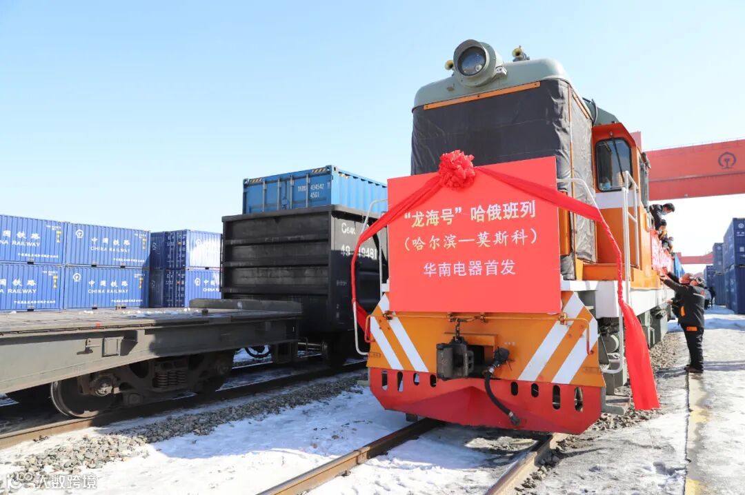 3月9日上午10点,龙海号-哈俄班列在新香坊哈尔滨国际集装箱中心站举行开行仪式。此趟发往俄罗斯莫斯科的中欧班列搭载了50个集装箱的美的空调机,货重540吨,货值约1425万人民币。