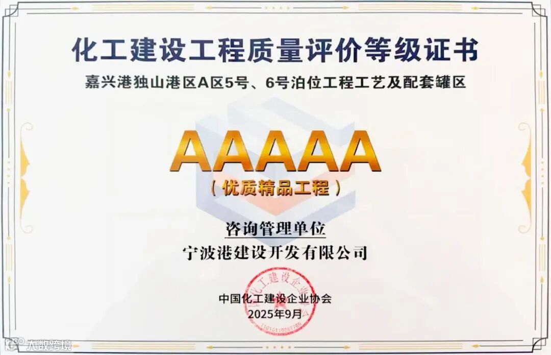 近日,中国化工建设企业协会公布2025年度化工建设工程质量评价结果,由海港建设负责咨询管理的嘉兴港独山港区A区5号、6号泊位工程工艺及配套罐区,荣获化工建设工程质量评价5A级认证,为浙江省内唯一获本次评价最高等级的项目,标志着该工程在质量、技术、管理等方面已达到全国化工建设工程的领先水平。