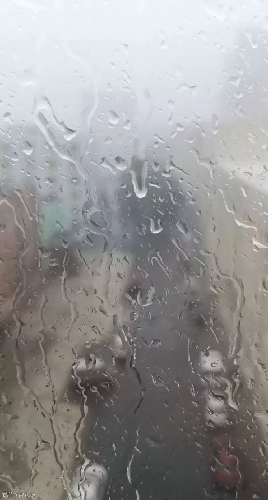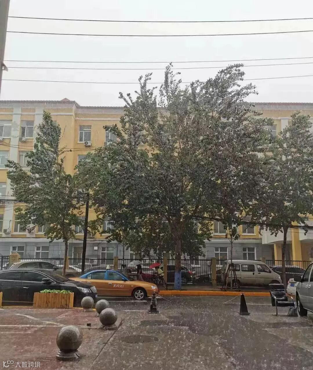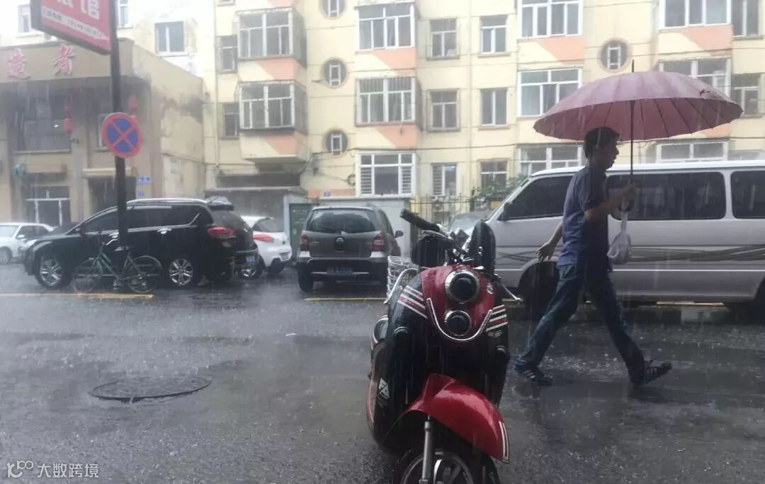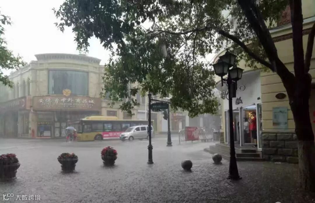 霁虹桥附近,市民纷纷在建筑物下躲避。雨水串成了线打在玻璃车窗上。道里、香坊降雨明显。