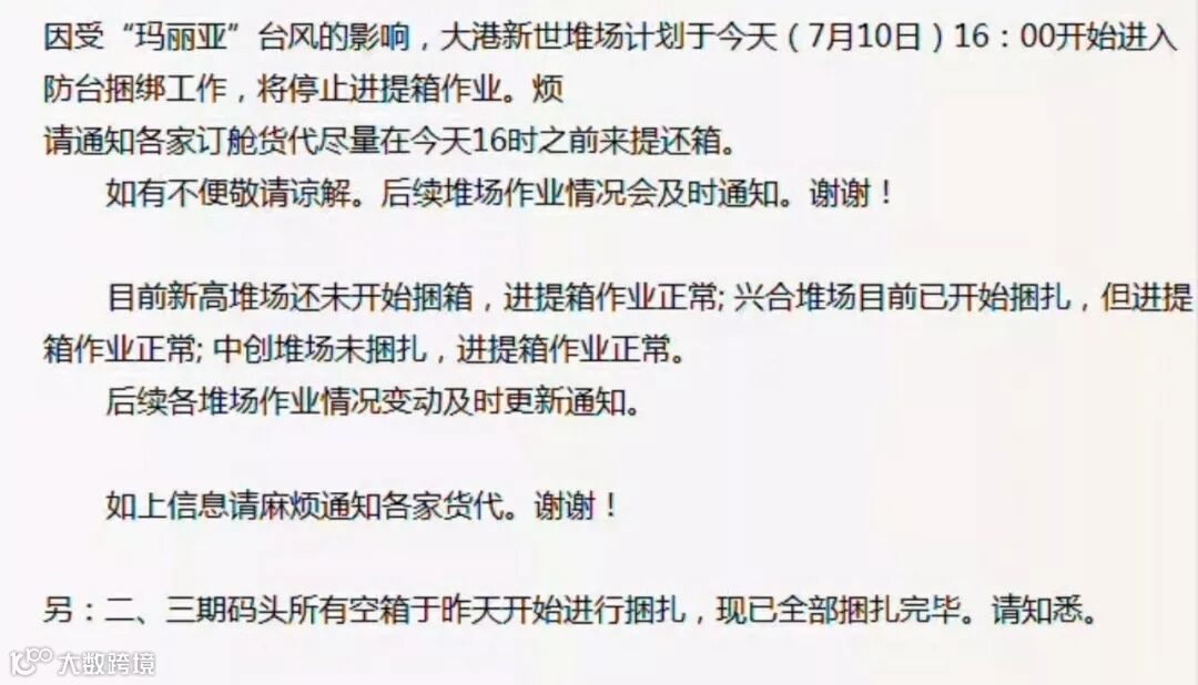 宁波部分堆场已于7月10日16:00开始进入防台捆绑工作,将停止进提箱作业。
