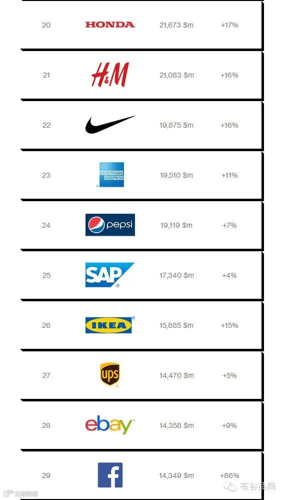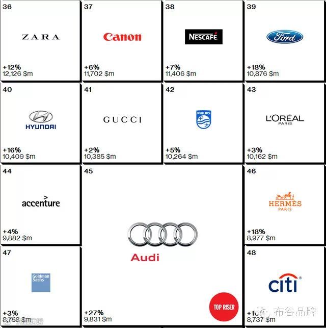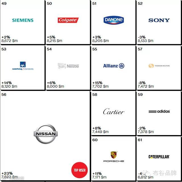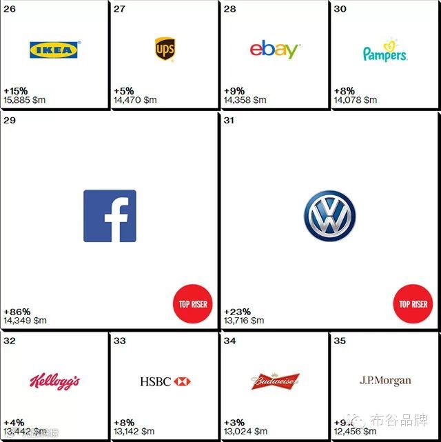 2014 上升最快的品牌: Facebook(#29, +86%),奥迪Audi (#45, +27%),亚马逊 Amazon (#15, +25%),大众Volkswagen (#31, +23%),和日产 Nissan (#56, +23%) Interbrand全球首席执行官Jez Frampton表示:“苹果和谷歌急剧增长的价值足以证明品牌建设的力量。”这些领先的品牌全方位的针对产品和服务所处的生态体系,量身定做息息相关的无缝独特体验,已经抵达了全新的里程碑。